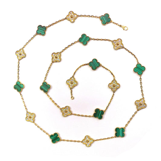 Van Cleef & Arpels Vintage Alhambra Gold Diamond Malachite Necklace, 20 Motifs