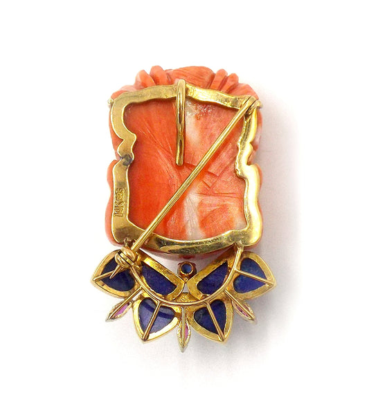 Buddha Carved Coral Lapis Lazuli Sapphire Ruby Turquoise Yellow Gold Pin Brooch
