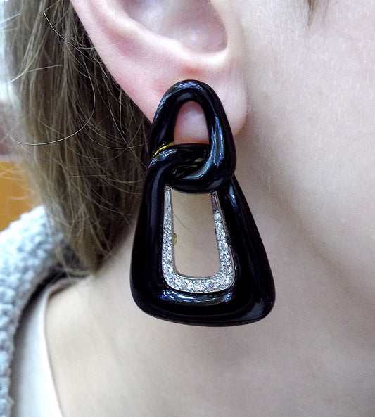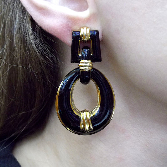 David Webb 18K Yellow Gold Black Enamel Pendant Door-Knocker Earrings