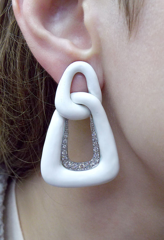 David Webb White Enamel 18K Gold Diamond Earclips