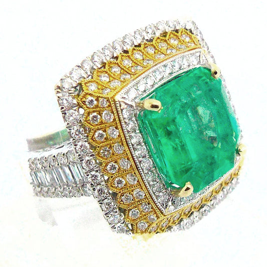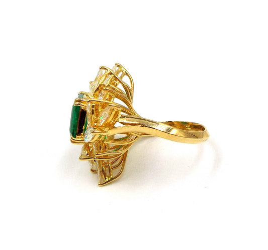 Cocktail Vintage 18K 750 White Yellow Gold Emerald Diamond Ring