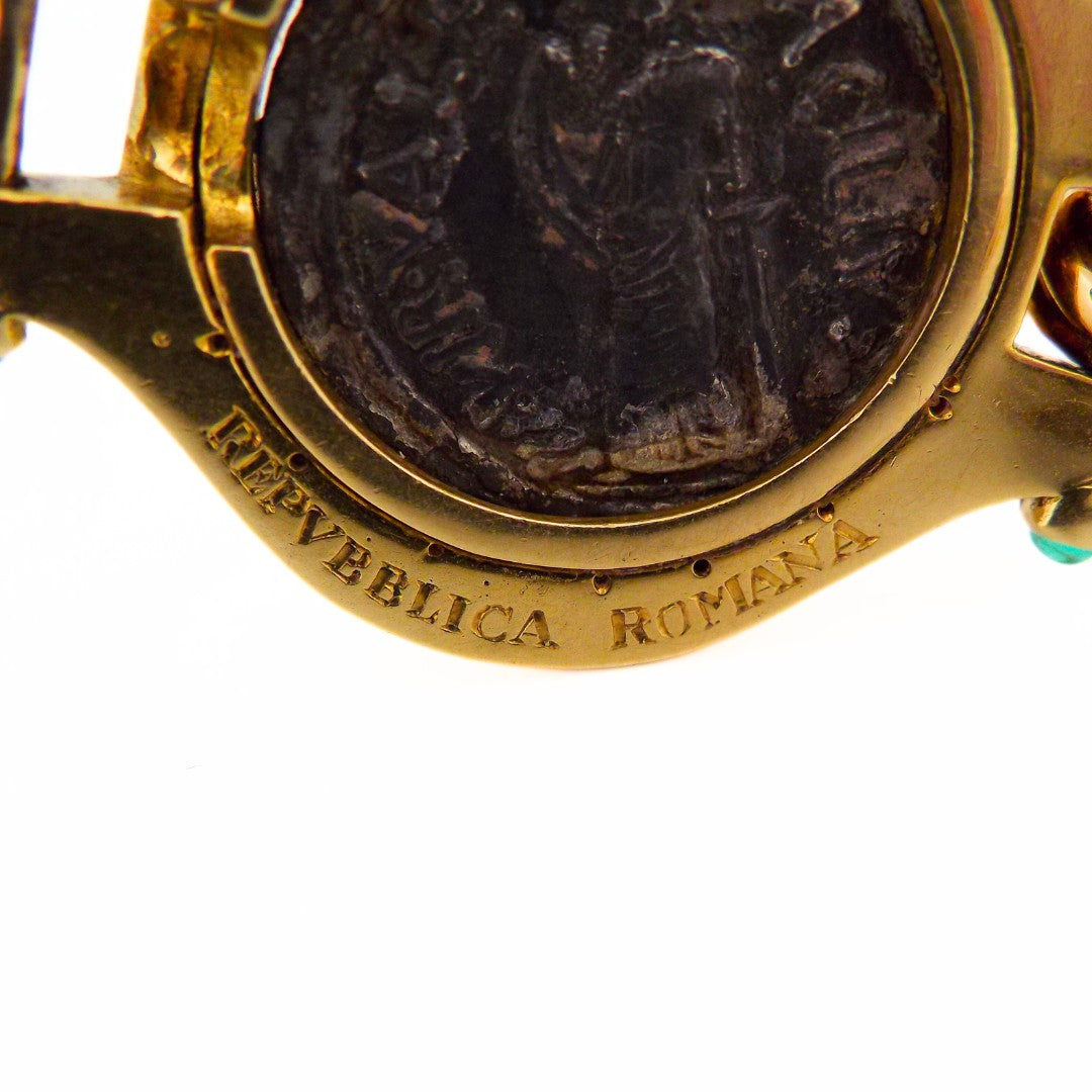 A beautiful monete bracelet by Bulgari. The band is of rope design and the central motif is an ancient roman coin set in 18K yellow gold which is accented by four cabochon emeralds. Signed BVLGARI. Marked "REPVBBLICA ROMANA