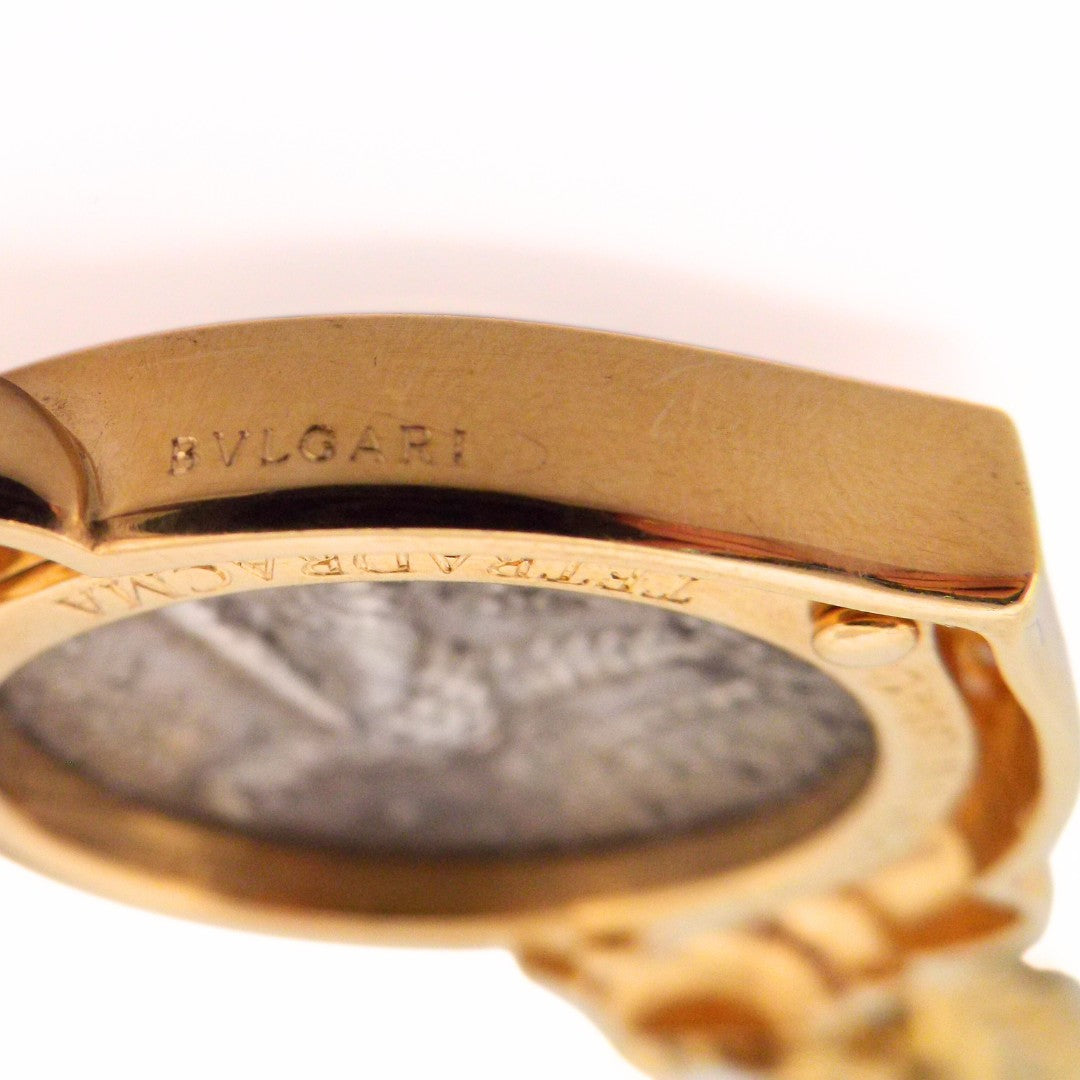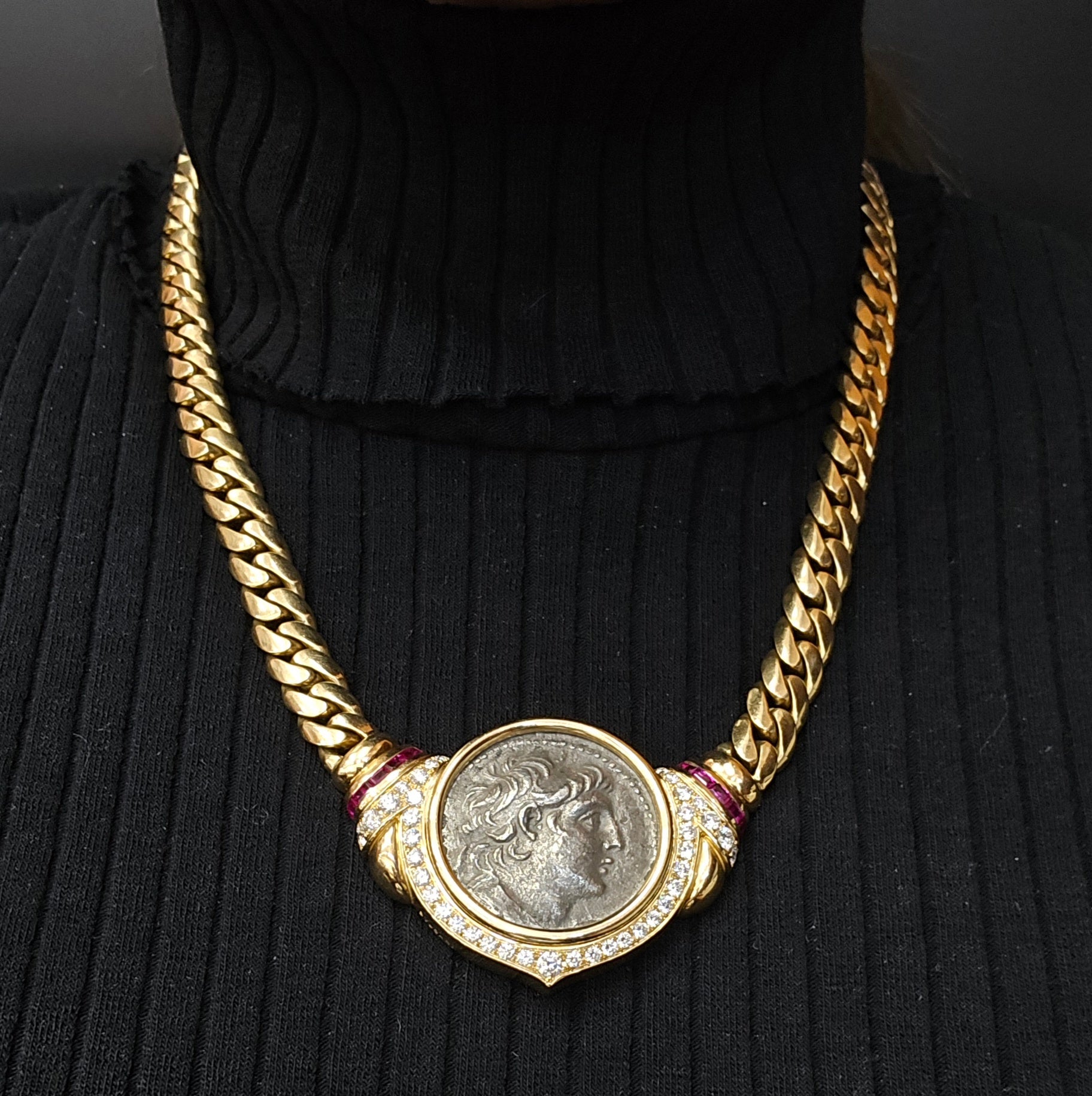 An exquisite monete chain necklace by Bulgari. The central monete motif is accentuated by approximately 3.5 carats of diamonds and have a row of rubies on each end. Circa 1970s. Length: ap. 18". Motif: 2" across, 1.5"top to bottom. Marked 'ANTIOCO VII 138 aC TETRADRACMA'. Signed Bulgari, marked 750, with makers marks.