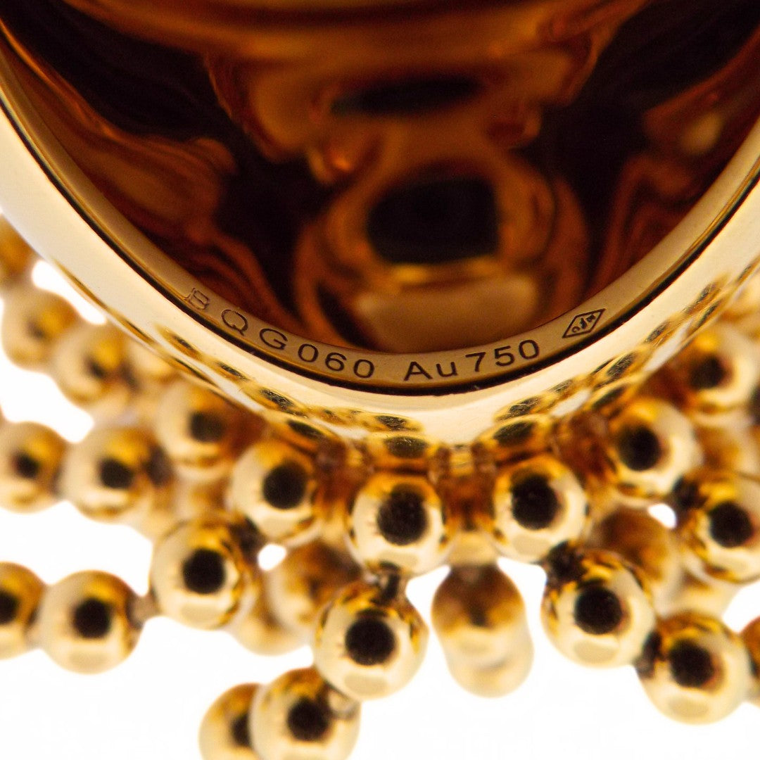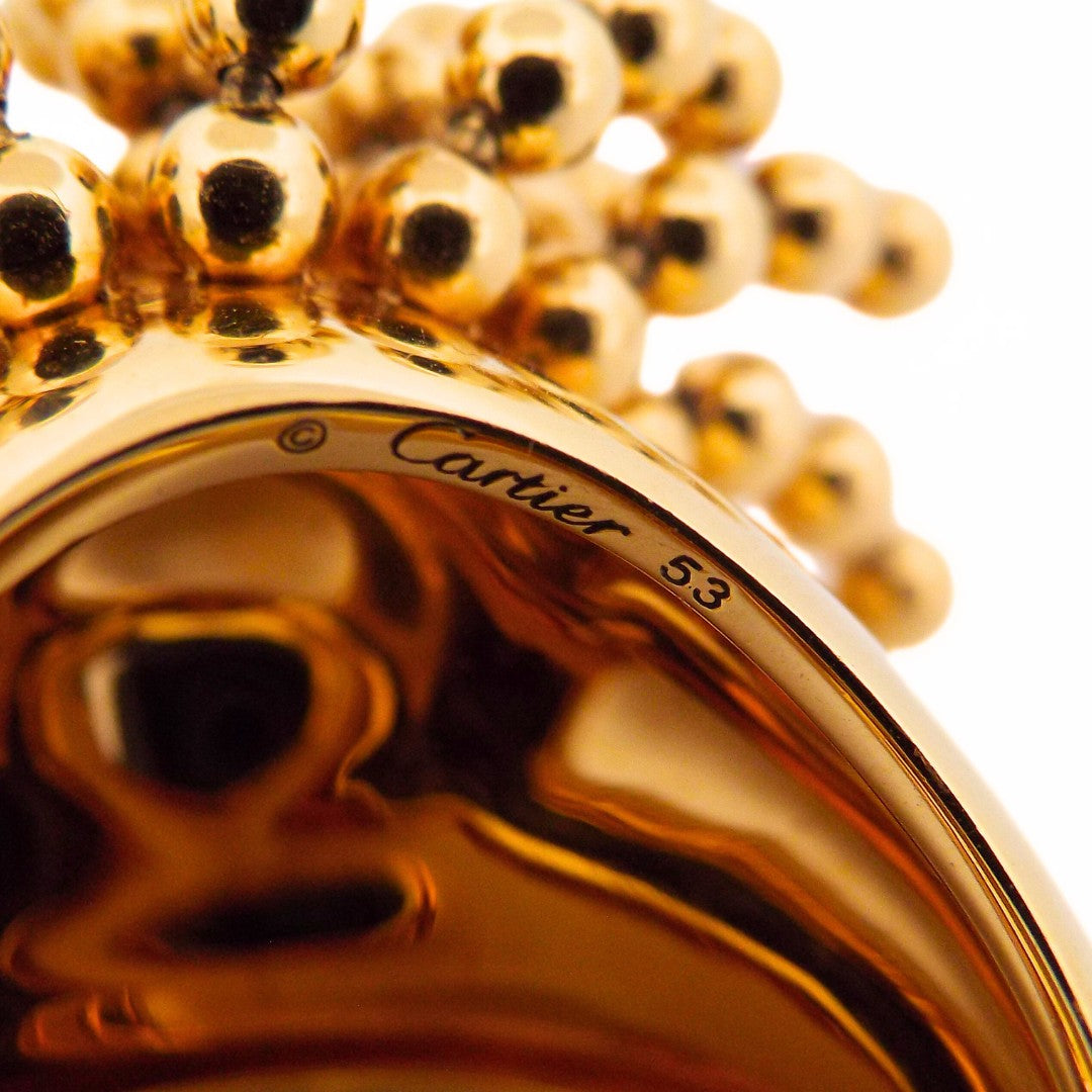 A vintage cocktail ring by Cartier from the 'Nouvelle Vague' collection. The 18K yellow gold ring is highlighted by the central "pom pom" consisting of dangling strands of 18K gold beads. Signed Cartier and numbered. Size 53