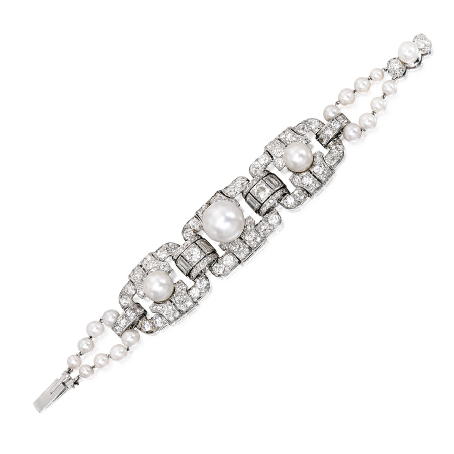 Platinum, 18K white gold, cultured pearls, approx. 10.25ct of diamonds, France. Weight ap. 48.8grams, length ap. 6.25".